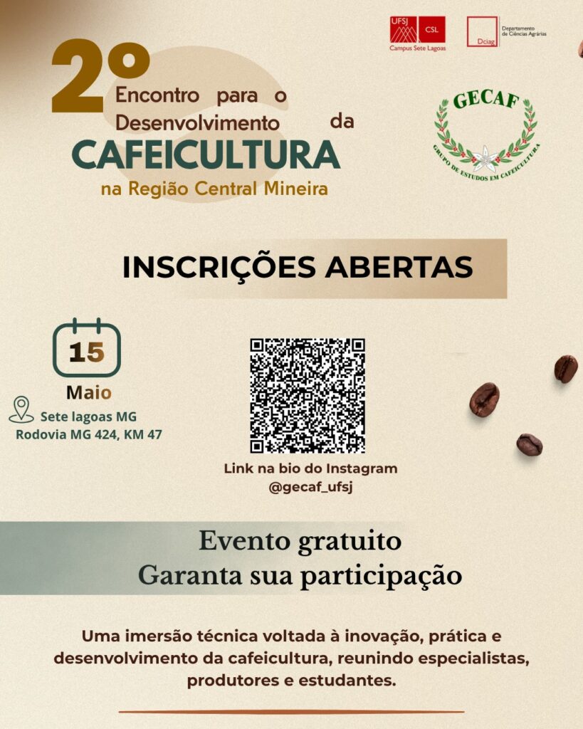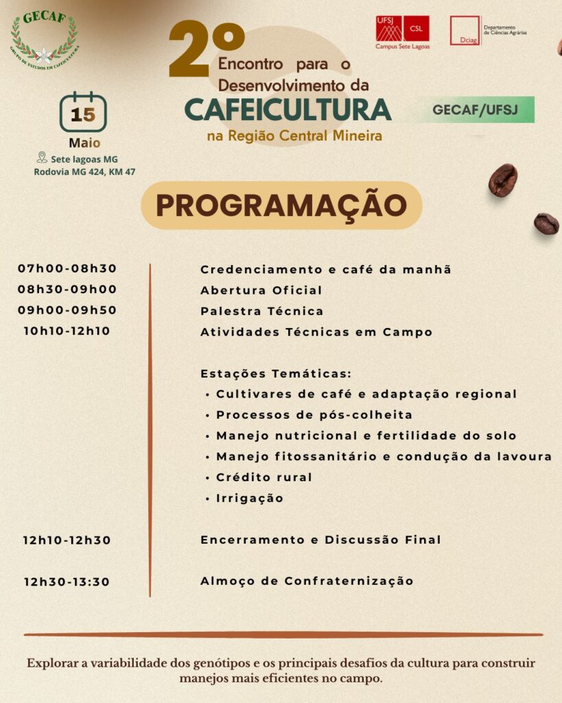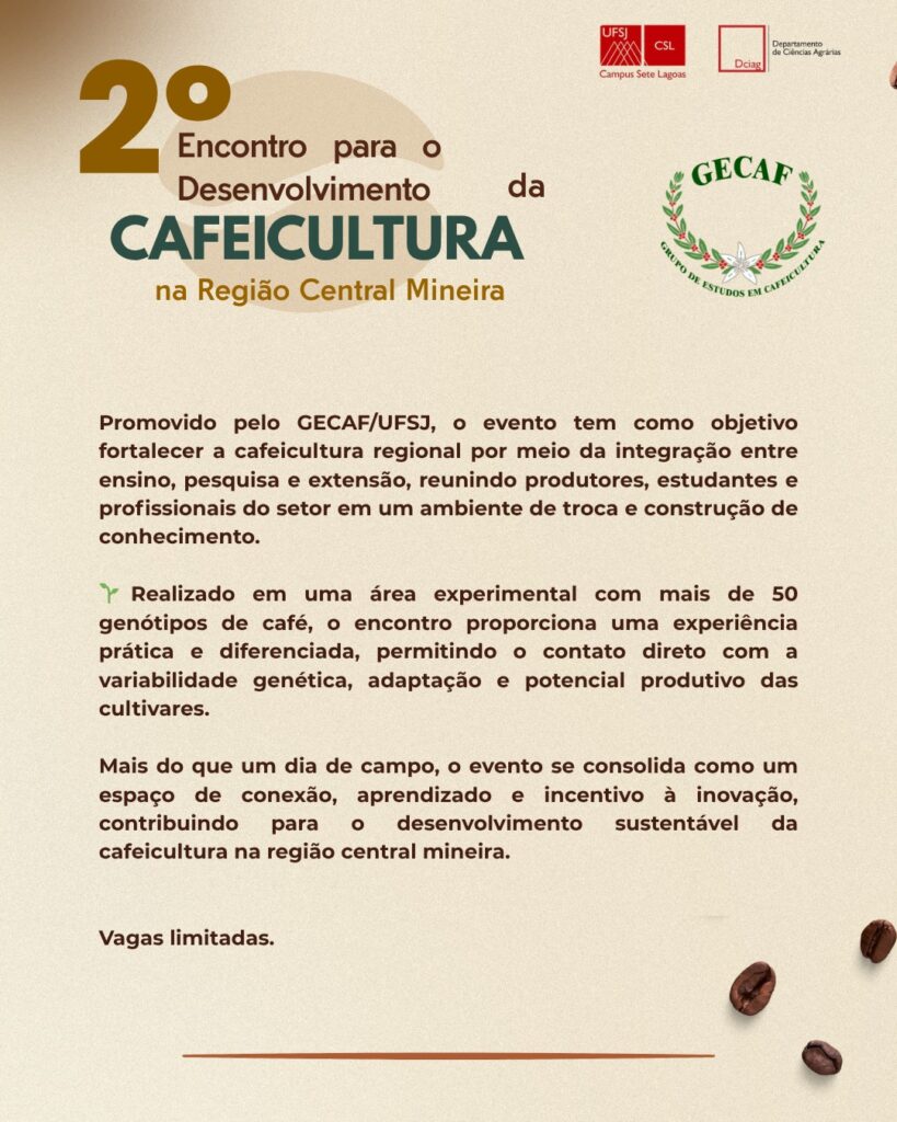 a Universidade Federal de São João del-Rei (UFSJ) promove, dia 15 de MAIO, o 2º Encontro para o Desenvolvimento da Cafeicultura na Região Central Mineira. O evento tem como principal objetivo difundir conhecimentos técnicos, científicos e tecnológicos, promovendo a troca de experiências entre produtores, pesquisadores, técnicos e estudantes. A proposta vai além da simples transmissão de conteúdo: busca incentivar a diversificação produtiva, ampliar a adoção de tecnologias no campo e fortalecer a integração entre ensino, pesquisa e extensão.